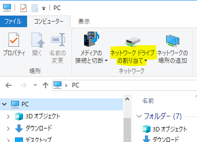 Windowsのエクスプローラ > PC を選択 > ネットワークドライブの割り当て